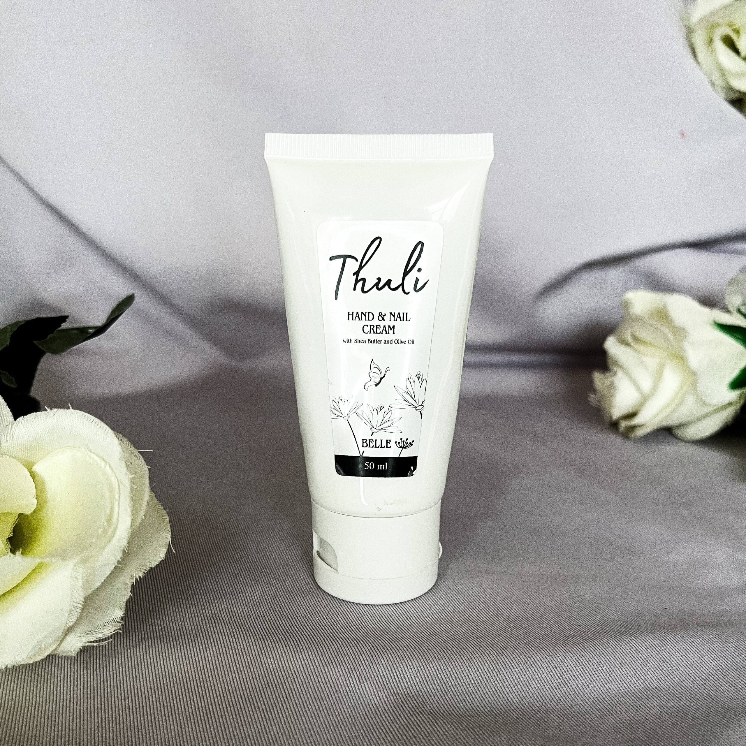 Thuli Cosmetics Hand & Nail Cream, 50 ml, is created using natural products including shea butter and olive oil, and then fragranced with Belle, to match our Thuli Cosmetics Ladies Perfume, Belle.